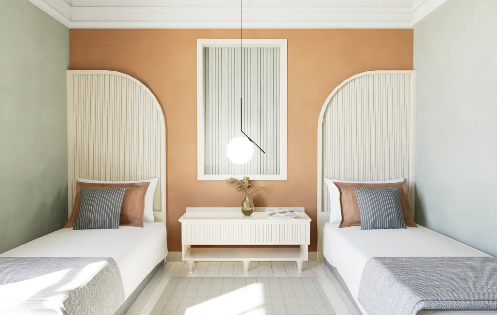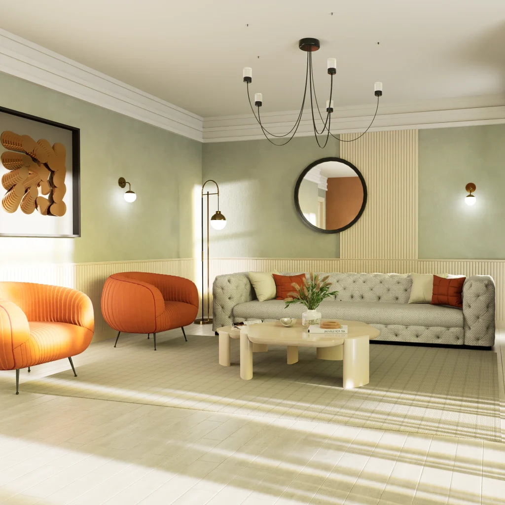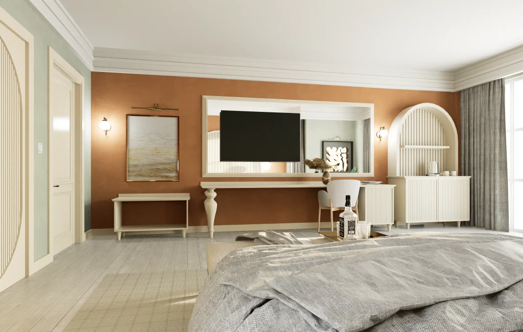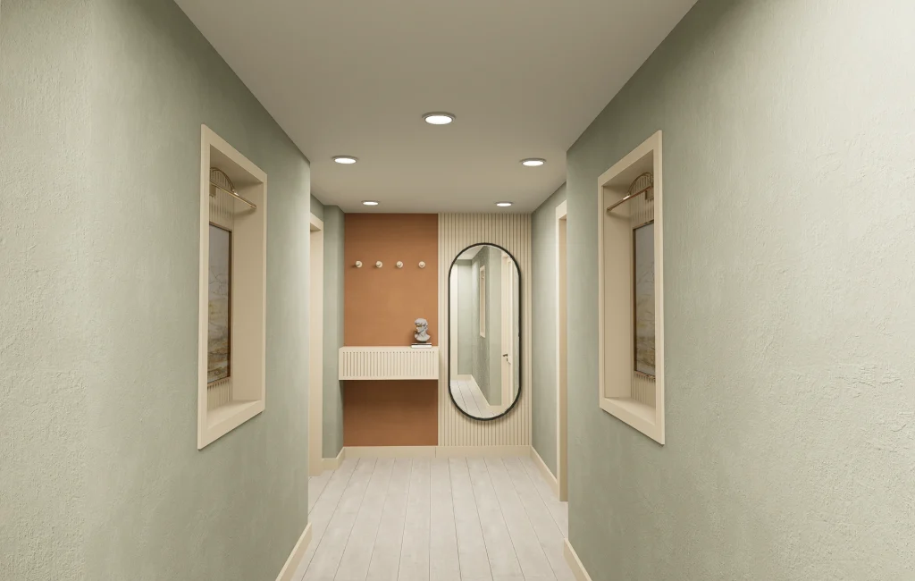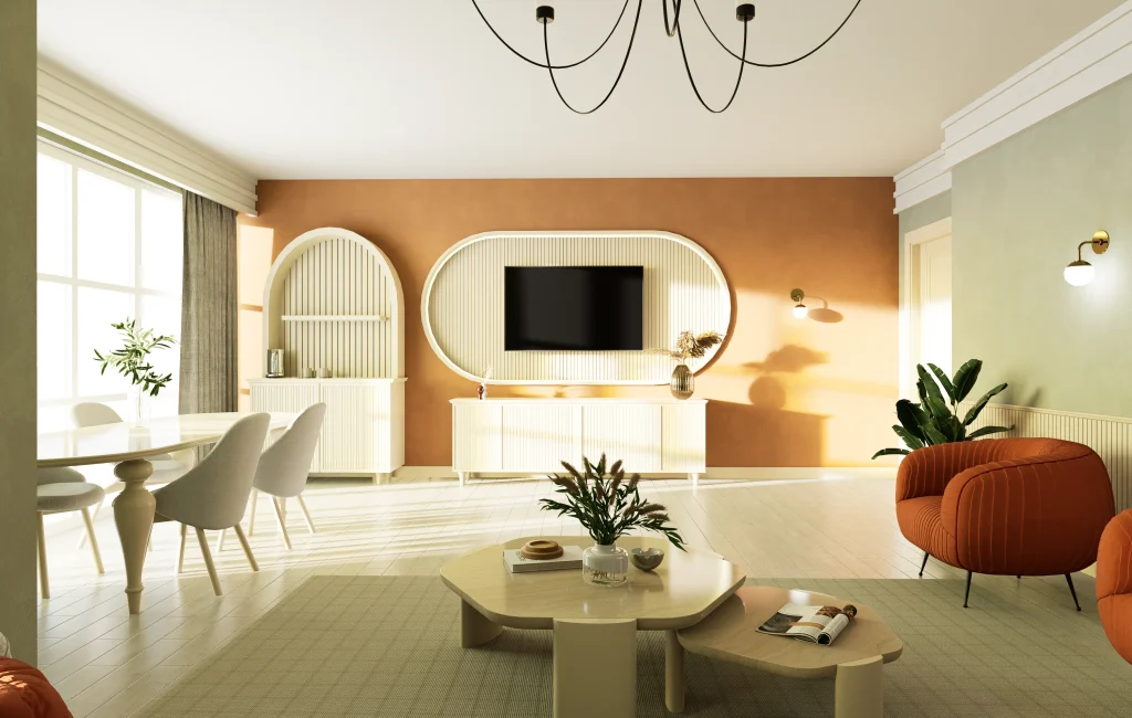 Toprak tonlarının kemerli formlar ve dikey yivli panellerle dengelendiği, yumuşak geçişlere sahip iç mekan tasarımı.