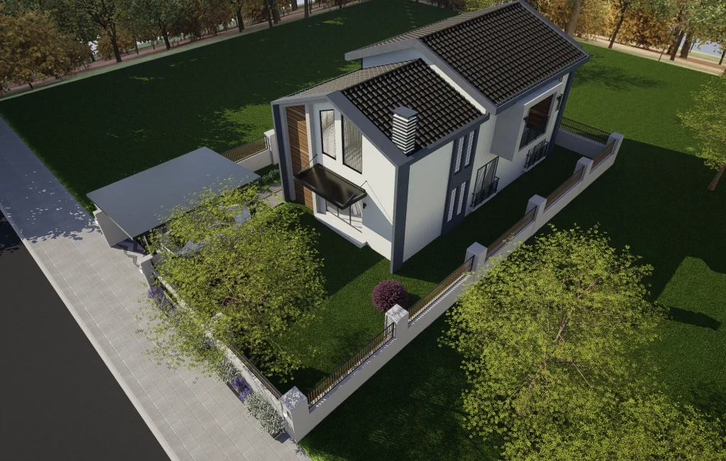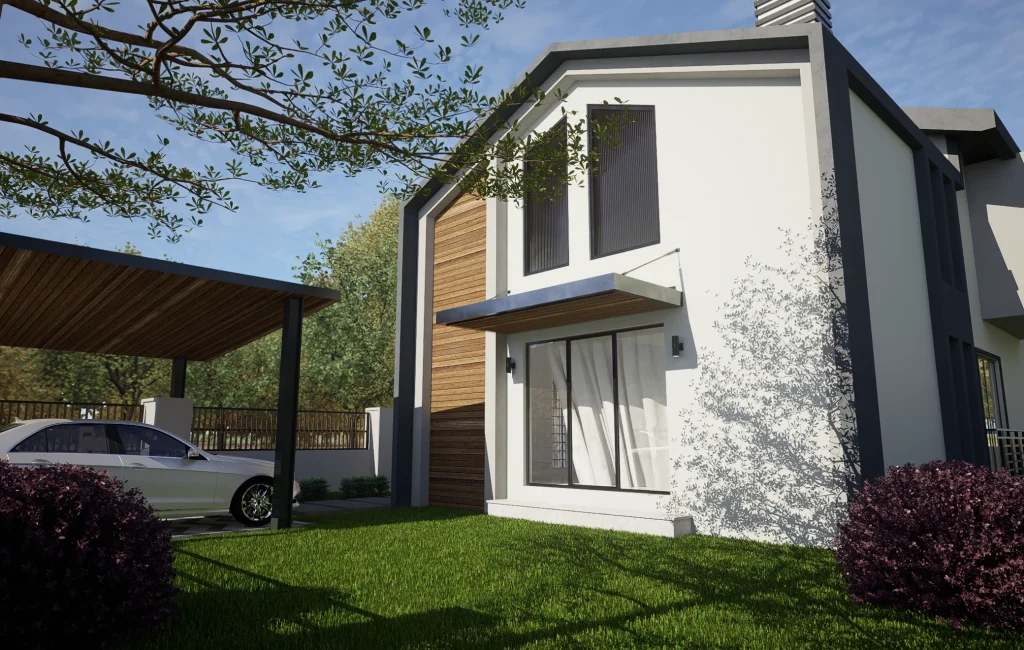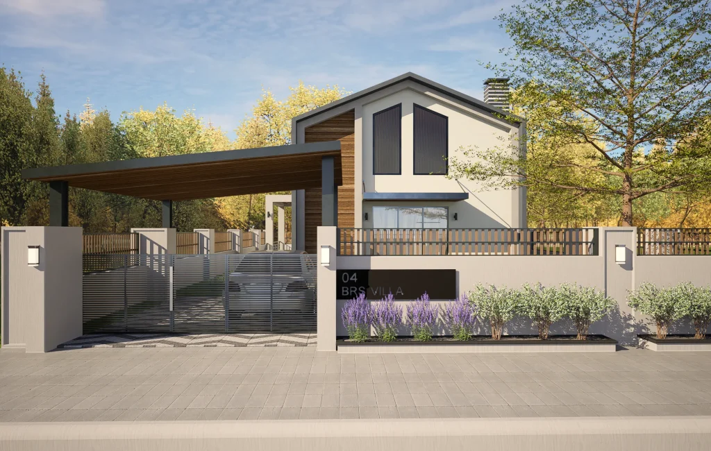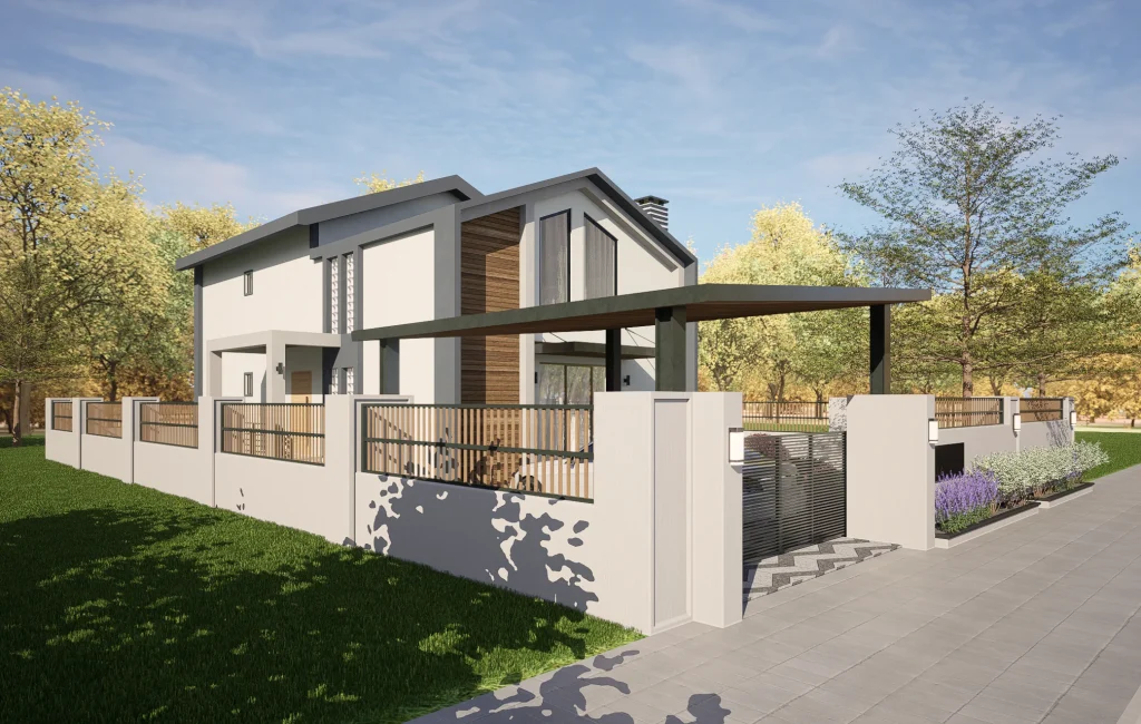Koyu renkli strüktürel çerçevelerin ahşap detaylar ve beyaz yüzeylerle oluşturduğu güçlü kontrastla şekillenen modern bir villa tasarımı.