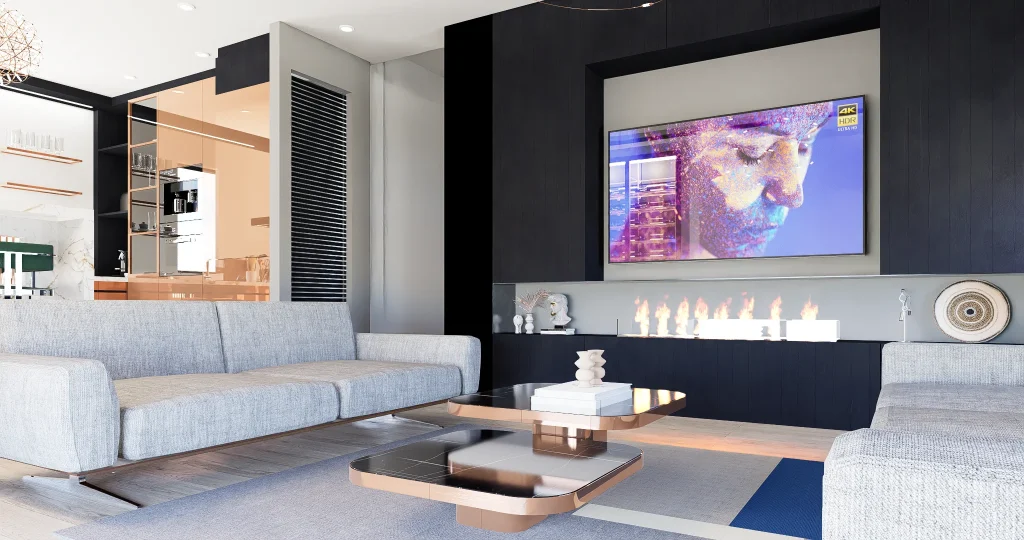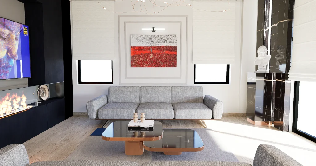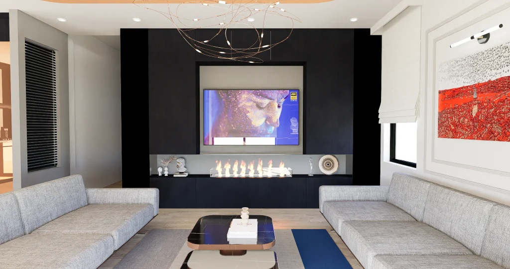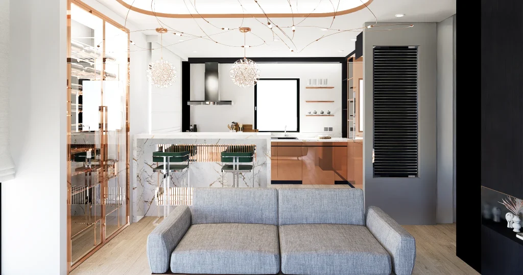 Siyah panellerin parlak bakır yüzeyler ve beyaz mermer ile net bir zıtlık oluşturduğu açık plan yaşam alanı.